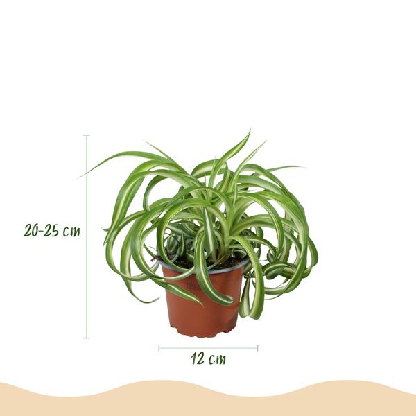 Chlorophytum comosum Bonnie ist eine wunderschöne Zimmerpflanze, die mit ihrem einzigartigen Aussehen jedem Raum eine lebendige Atmosphäre verleiht. Diese Pflanze ist bekannt für ihre attraktiven, grün-weißen gestreiften Blätter, die elegant an den Stängeln hängen. Die Stängel selbst sind normalerweise grün und können eine glänzende Oberfläche haben, was zur allgemeinen Anziehungskraft der Pflanze beiträgt. Die Farbkombination schafft ein frisches und luftiges Ambiente, perfekt für moderne sowie klassische Interieurs.
